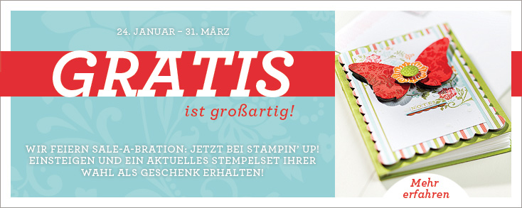 Es ist mal wieder so weit, die nächste portofreie Sammelbestellung steht vor der Tür. Es ist auch noch Sale-a-Bration-Zeit. Pro 60€ Warenwert kann man sich eines von 5 ausgewähltenGratisprodukten aussuchen.